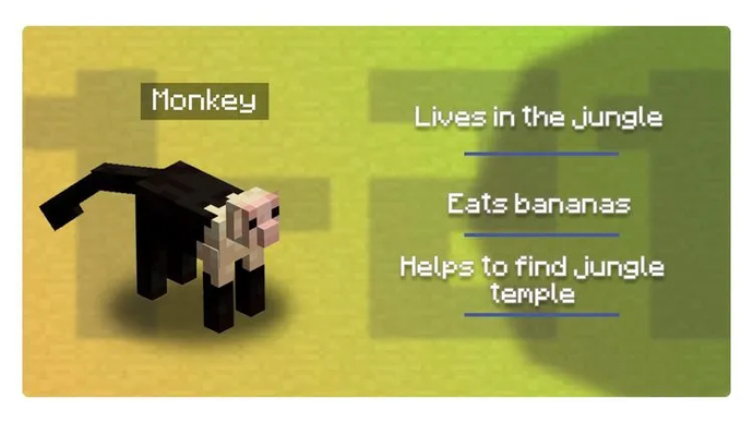 Wenn sich die Spielfigur im Dschungel befindet, hat sie die Chance, dort auf einen Affen zu treffen. Diese Kreatur kann nützlich sein, aber dafür muss der Spieler ihm eine Banane geben. Ein gezähmter Mob zeigt den Weg zum Tempel, der normalerweise nicht so leicht zu finden ist.