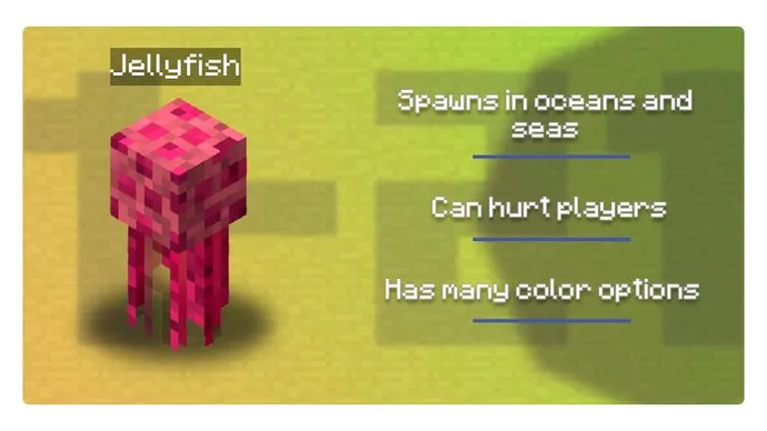Außerdem sollten Reisende in Minecraft PE Version 1.21 und 1.21.0 unbedingt in die Unterwasserwelt der Meere und Ozeane eintauchen. Dort leben jetzt Quallen. Aber schwimme nicht zu nah an sie heran: Die Kreaturen können die Gesundheit des Mobs durch Stiche schädigen.