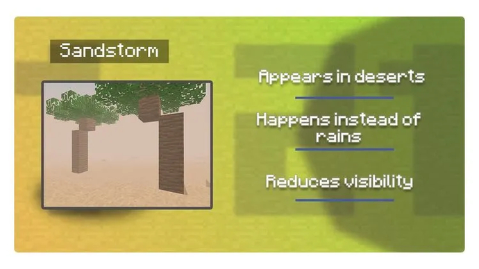 | Wüste | Die Entwickler haben beschlossen, dass es an der Zeit ist, die Wüsten zu aktualisieren und haben diesem Biom Oasen hinzugefügt. Außerdem können Minecraft-Nutzer jetzt Sandstürme sehen, die den Regen in diesen Gebieten ersetzen. |