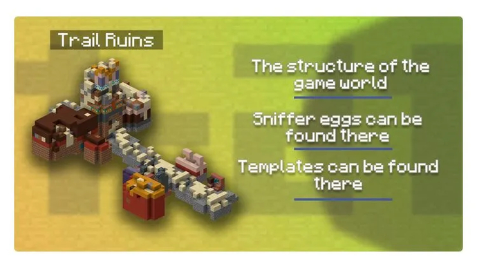 | Pfad-Ruinen | sind den Spielern seit der Veröffentlichung der Minecraft-Version 1.20.15 bekannt. Hier ist es möglich, unter den Blöcken einzigartige Schmiedeschablonen zu finden. |